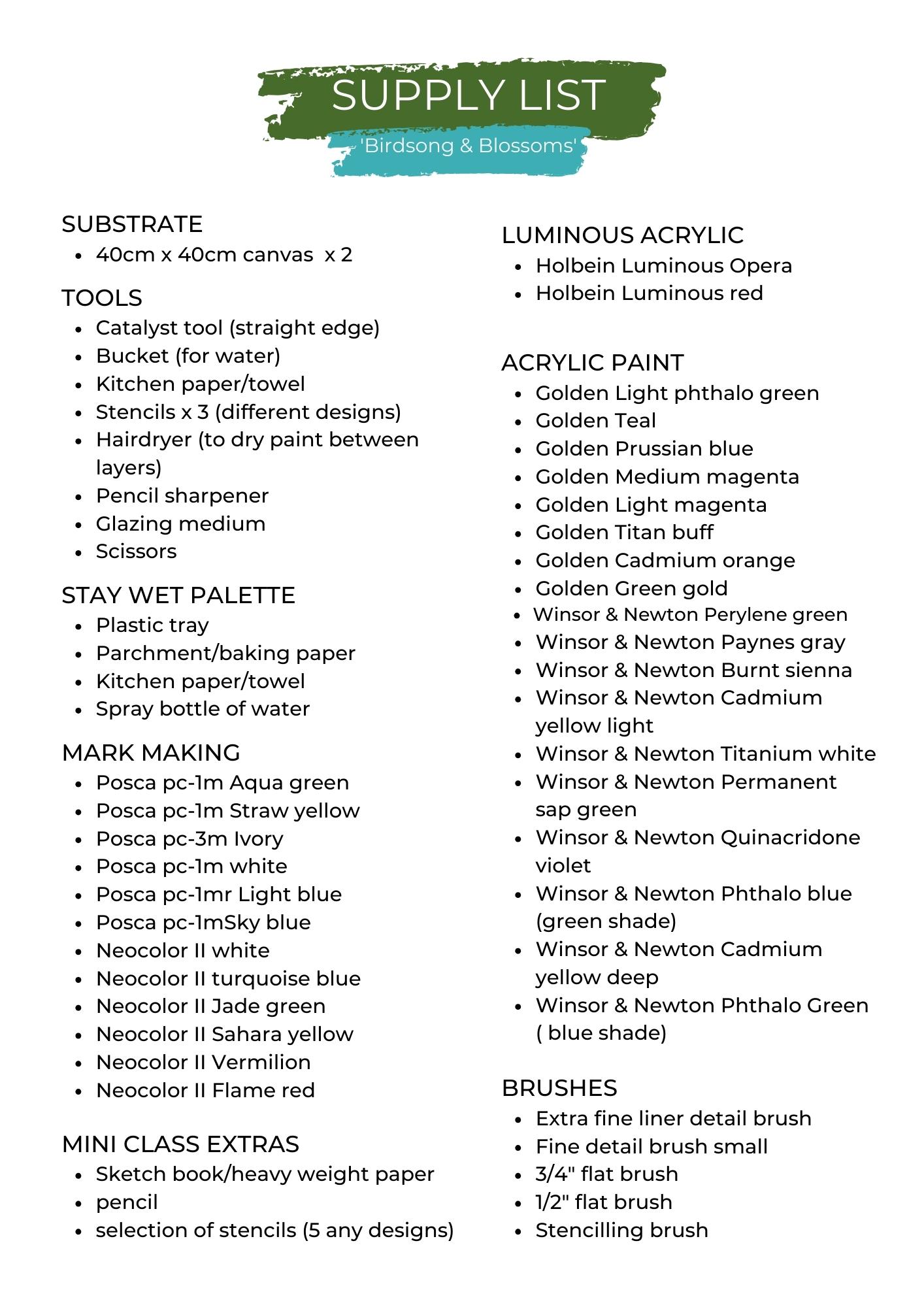I've attached the course supply list below for you, it is really not necessary to have everything on the list, it depends on how closely you want to follow along with my process.
