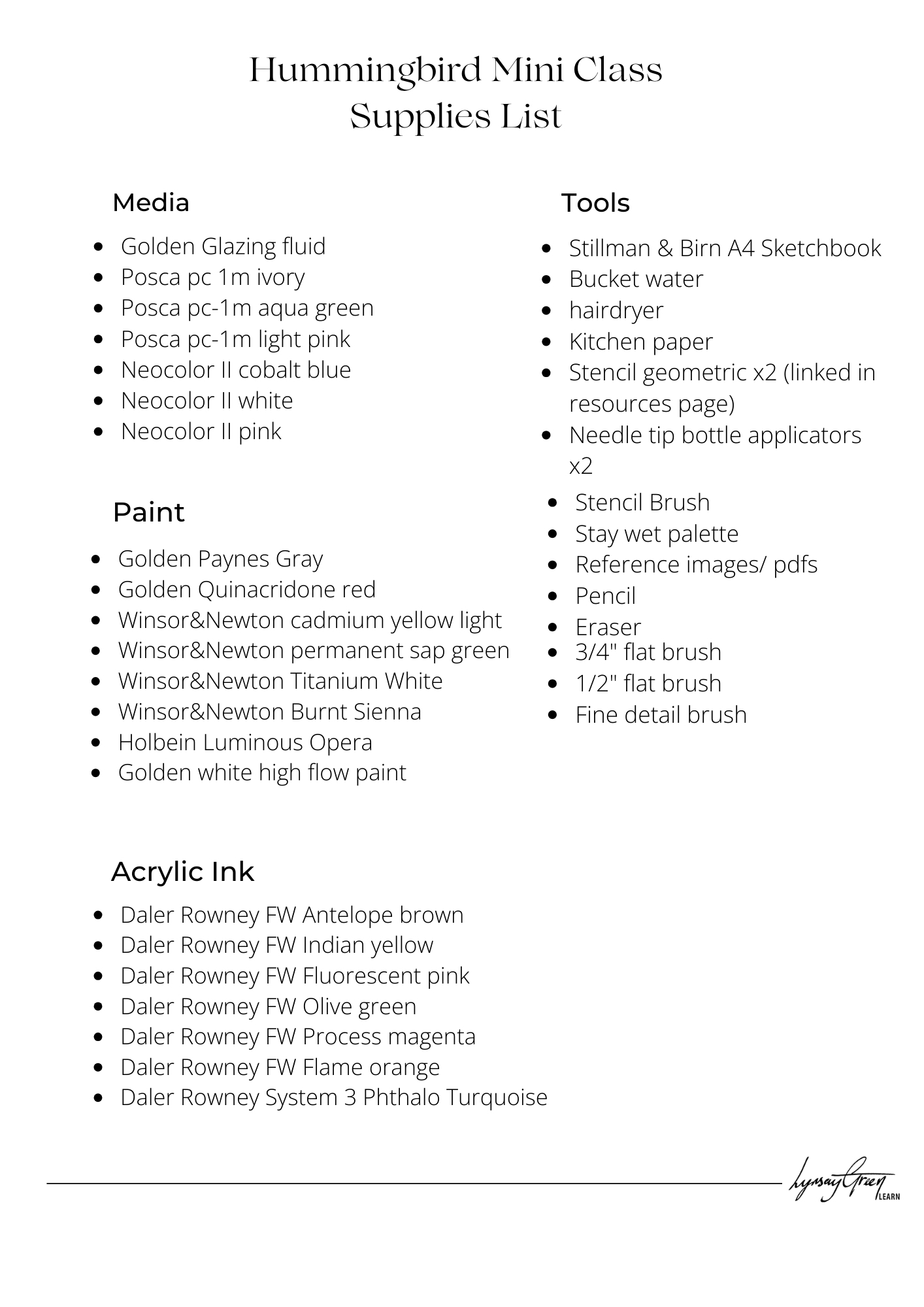 Below is a full list of all the materials I use in this mini class - but please don’t feel you need everything! I really encourage you to use what you already have and swap in similar colours or supplies. This course is all about exploration, not perfection, and there’s plenty of room to make it your own.