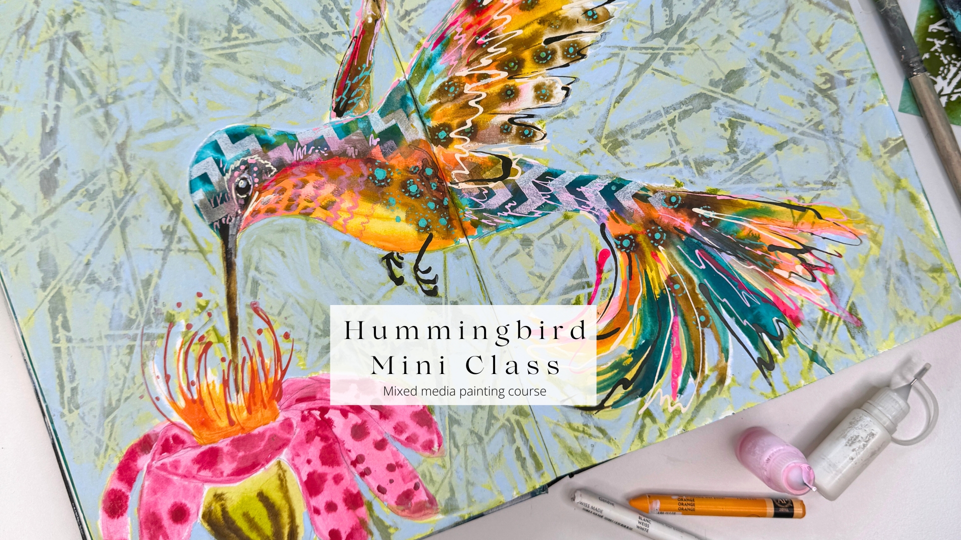 In this joyful mini class, we’ll paint a vibrant hummingbird using acrylic inks, paints, stencilling, linework, and more. You’ll explore colour, loosen up your brushstrokes, and layer mixed media techniques to bring your bird to life.