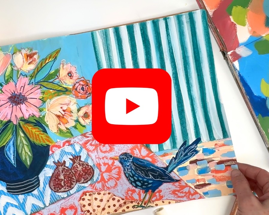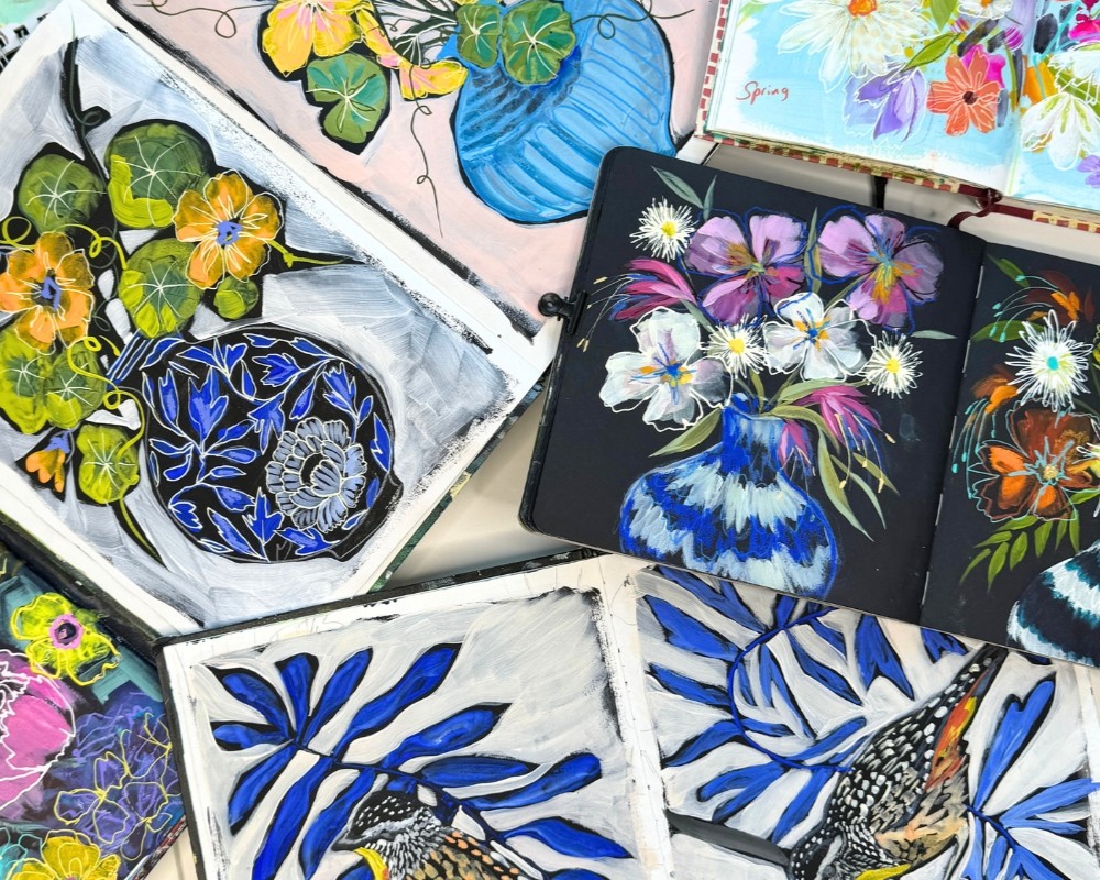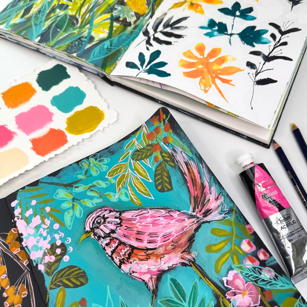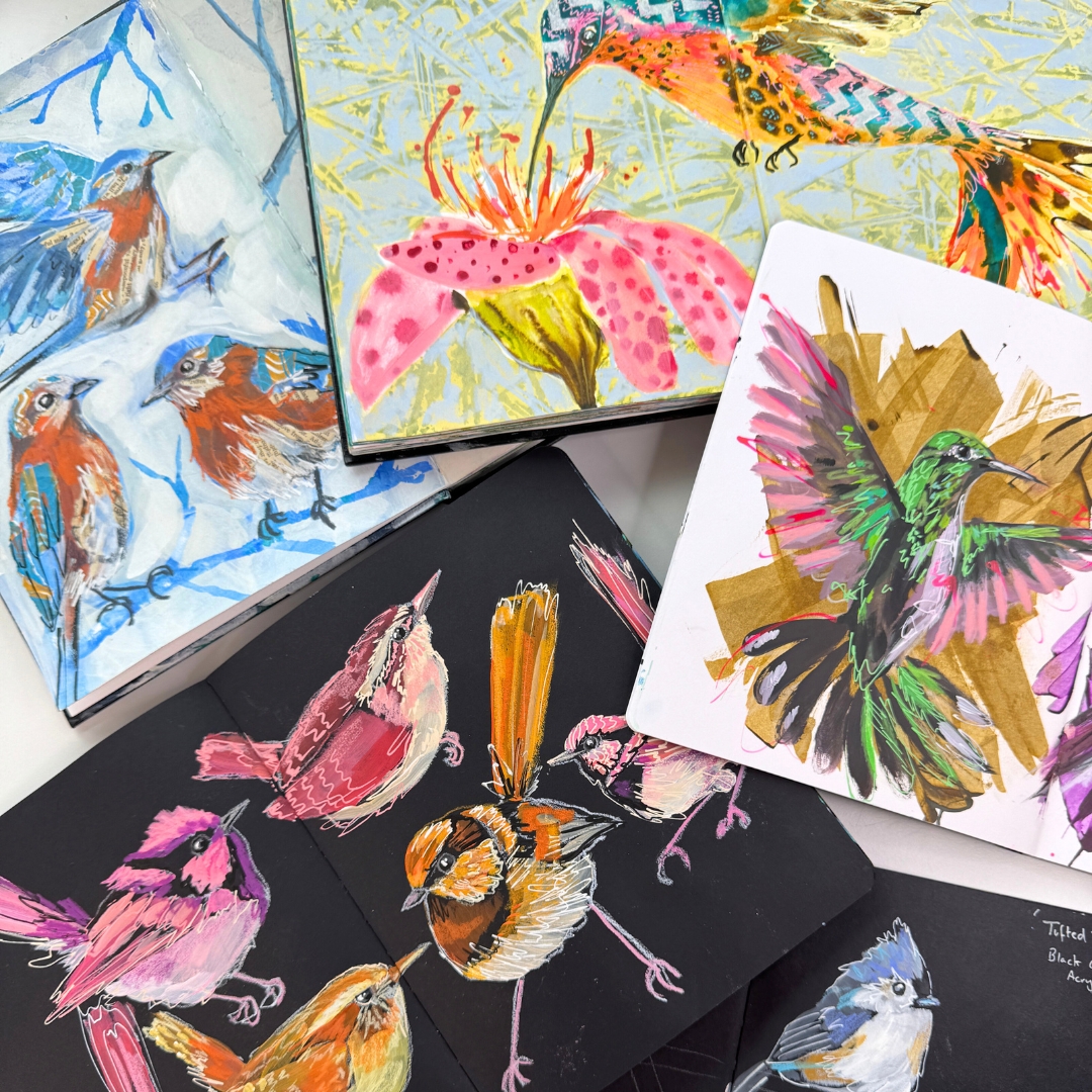 Together, we fill our sketchbooks with loose, expressive birds - layering colour, marks, and mixed media as we go.